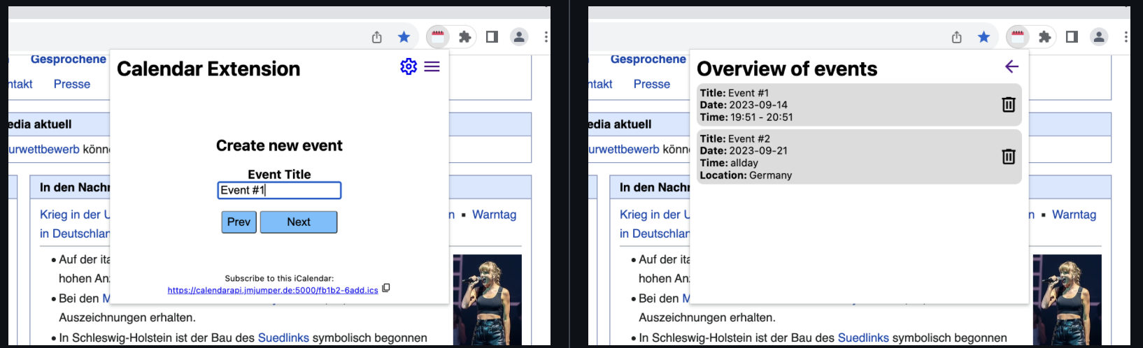 Add events to any arbitrary calendar provider (Apple, Google, …) by subscribing to a calendar on a server. The browser extension can create or delete events through the API.